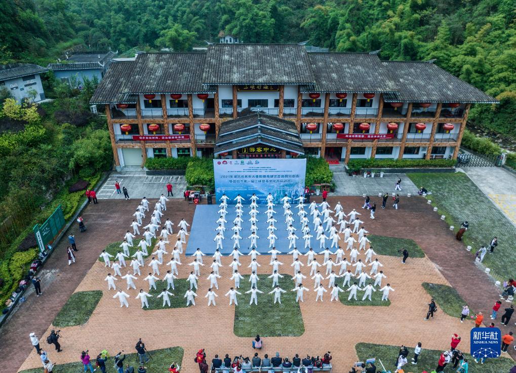 10月22日,在湖北省宜昌市秭歸縣三峽竹海生態風景區,參加重陽登高活動的老年人在進行太極拳表演(無人機照片)。