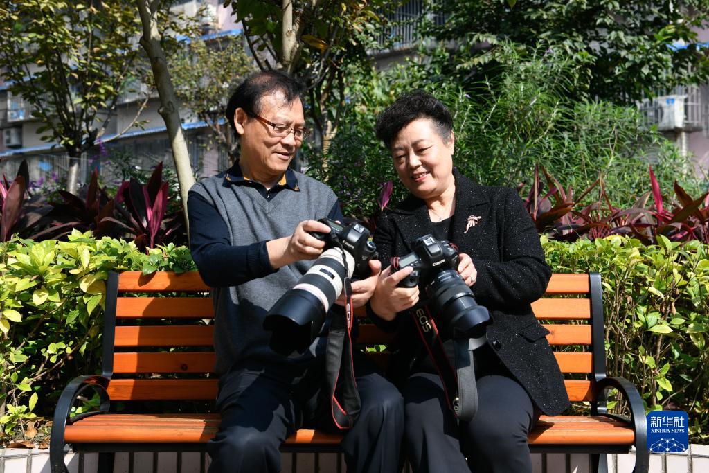 10月21日,鄭義華(右)和李永東交流攝影技巧。
