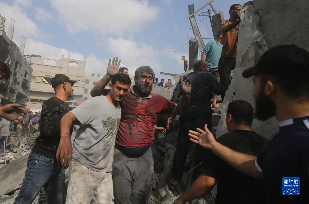 10月22日,在加沙地帶南部城市拉法,人們在遭以色列襲擊損毀的建築廢墟上救援。