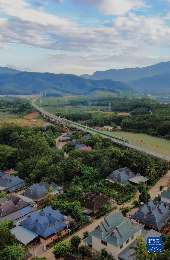 10月18日,在雲南省景洪市動罕鎮,中老鐵路上的動車從傣族村寨旁駛過(無人機照片)。