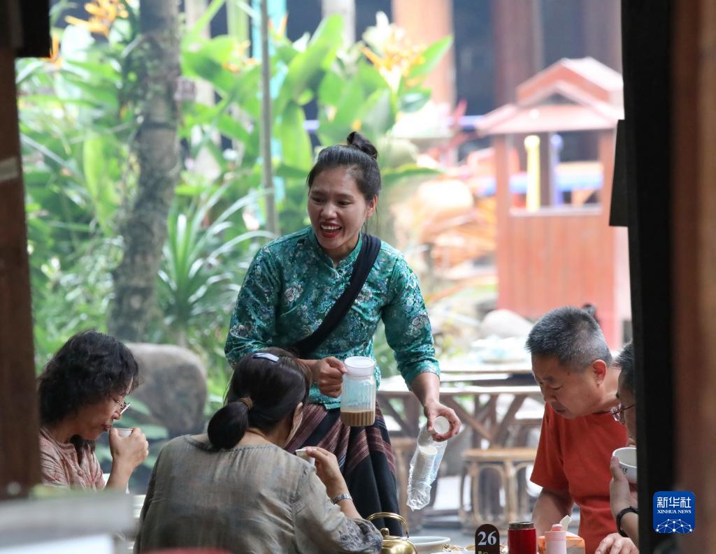 10月22日,在雲南省景洪市曼聽村村民經營的一處“傣家樂”,村民為就餐的游客服務。