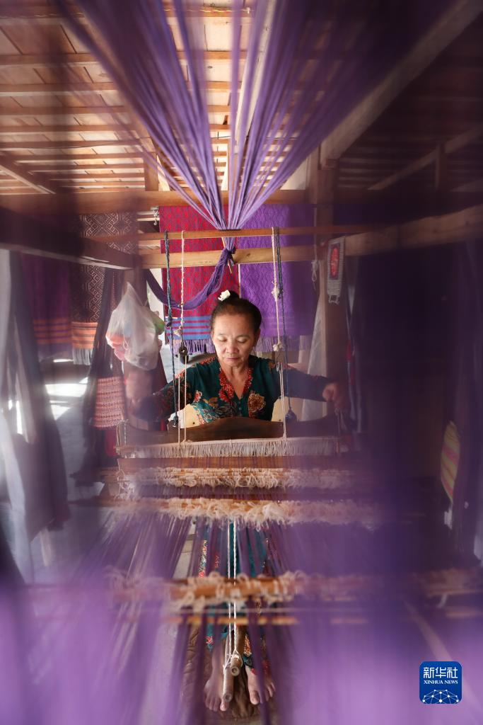 10月18日,雲南省景洪市動罕鎮曼聽村傣族婦女在非遺展示區製作傣錦。