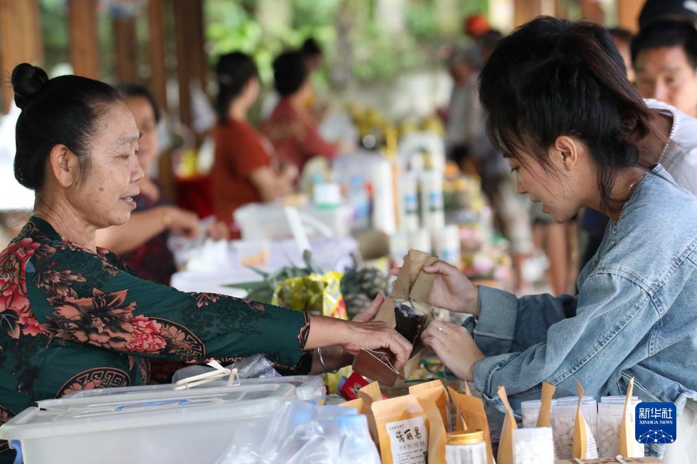 10月18日,雲南省景洪市動罕鎮曼聽村村民(左)向游客推介傳統工藝製作的紅糖。