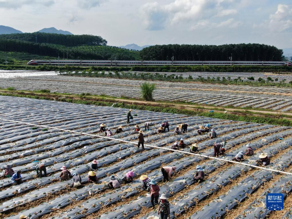 10月21日,雲南省景洪市動罕鎮村民在一家種植基地務工,身後的中老鐵路上動車飛馳而過(無人機照片)。