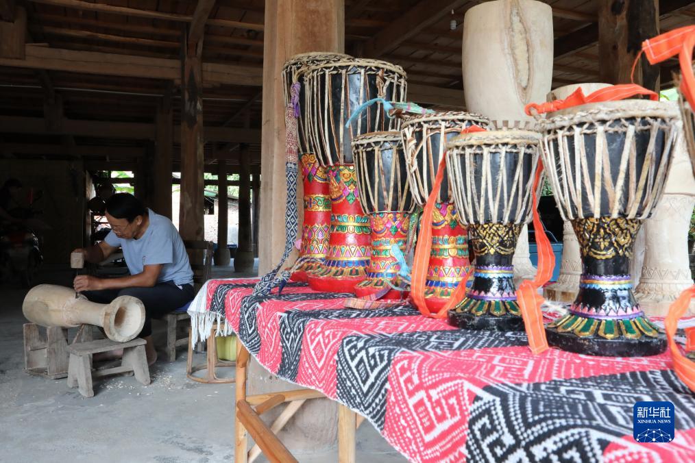 10月18日,雲南景洪市動罕鎮曼聽村的非遺傳承人波應章在製作象腳鼓。他製作的象腳鼓很受游客歡迎。