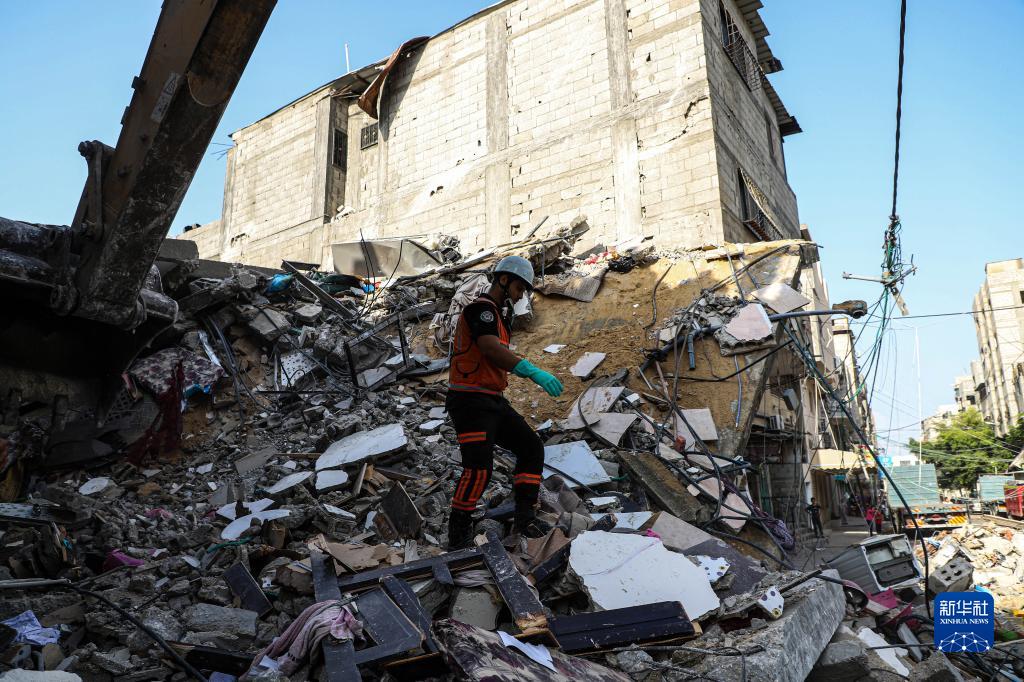 10月22日,救援人員在加沙地帶南部城市汗尤尼斯遭以色列空襲損毀的建築中實施救援。
