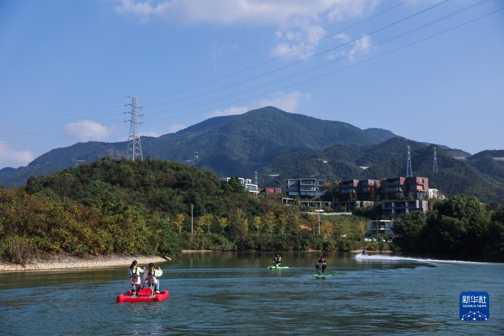 10月23日,游客在建德市楊村橋鎮嶺源樂活島休閒基地體驗水上運動項目。