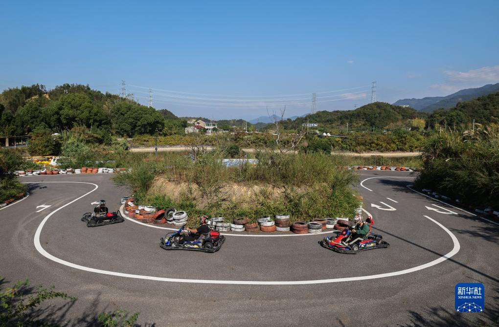 10月23日,游客在建德市楊村橋鎮嶺源樂活島休閒基地體驗卡丁車。