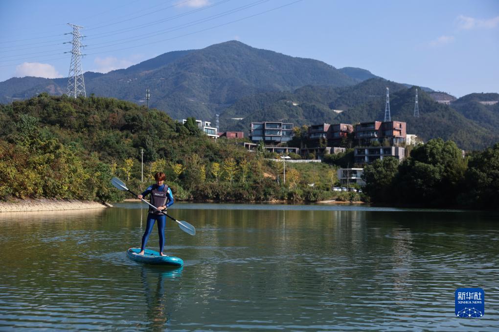10月23日,游客在建德市楊村橋鎮嶺源樂活島休閒基地體驗水上運動項目“槳板”。