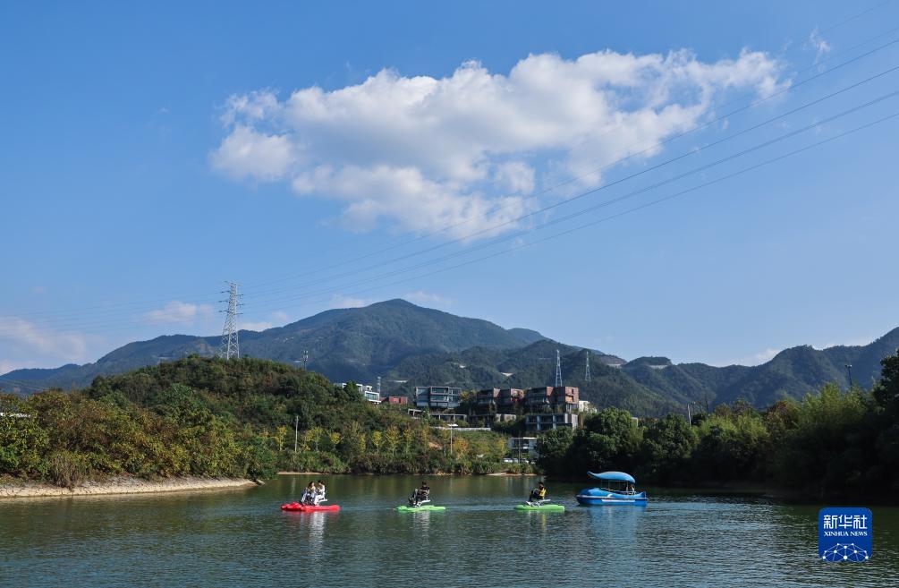 10月23日,游客在建德市楊村橋鎮嶺源樂活島休閒基地體驗水上運動項目。