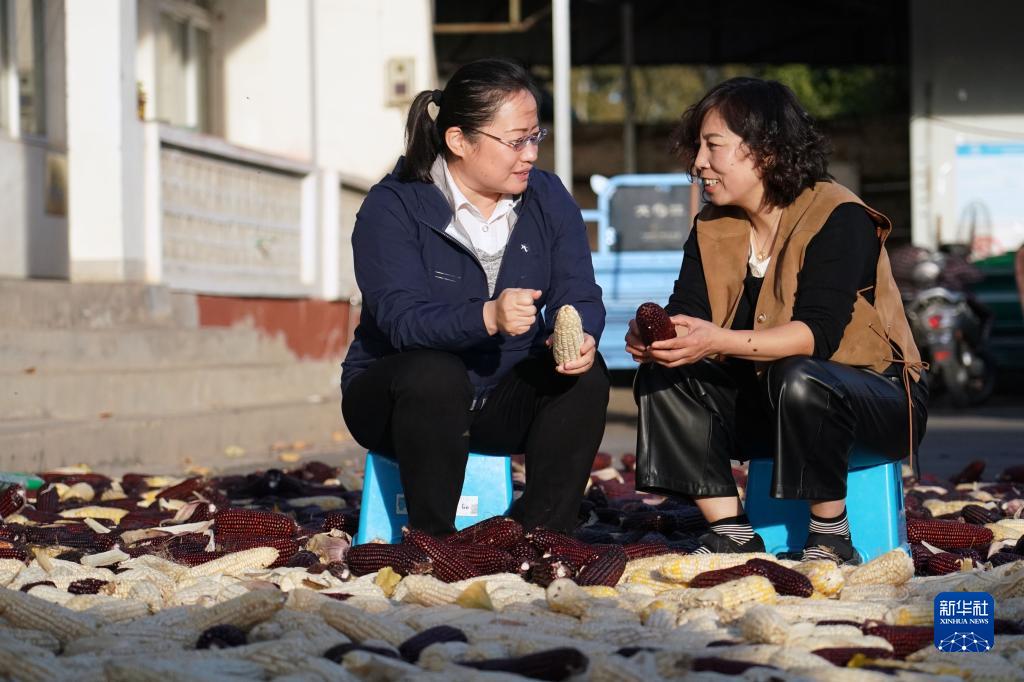 在北京市平谷區北&頭村村委會,王翠雲(右)與北京市農林科學院玉米研究所王榮煥研究員交流玉米知識(10月19日攝)。