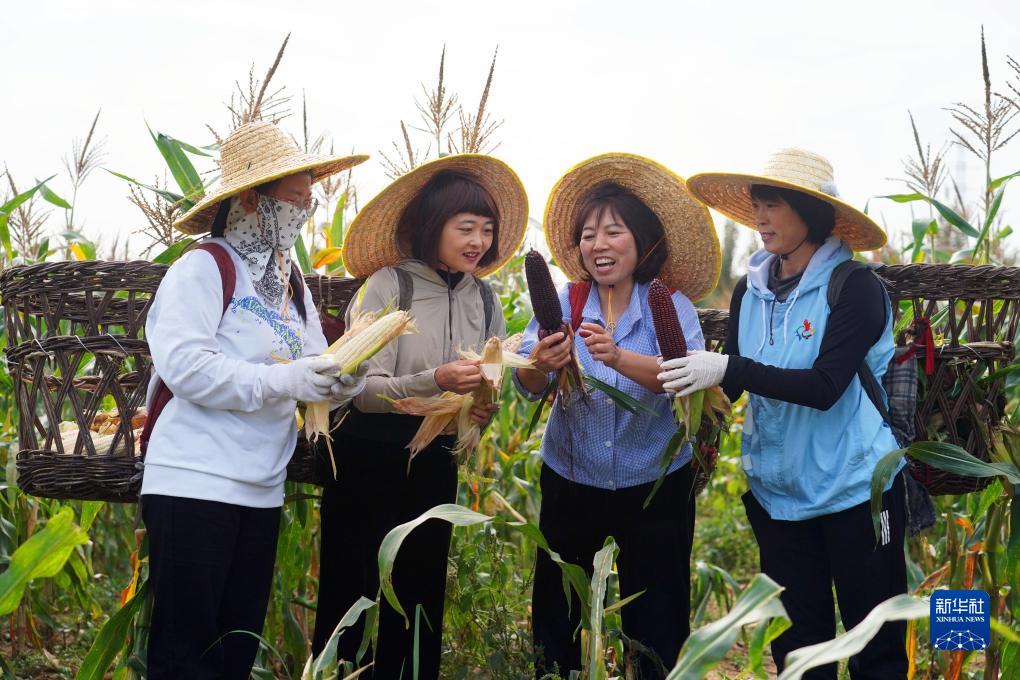 在北京市平谷區北&頭村“博士農場”,王翠雲(右二)採摘完玉米後與村民交流(10月4日攝)。