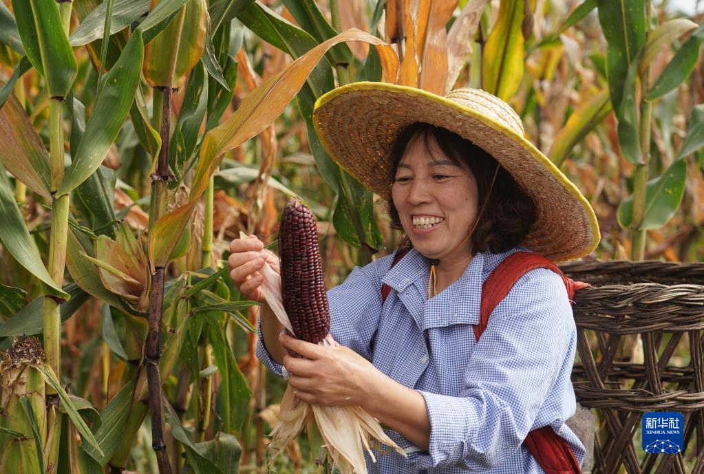 在北京市平谷區北&頭村“博士農場”,王翠雲採摘玉米(10月4日攝)。