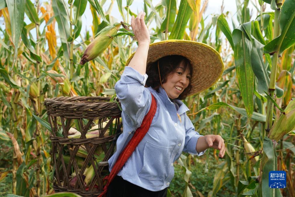 在北京市平谷區北&頭村“博士農場”,王翠雲採摘玉米(10月4日攝)。
