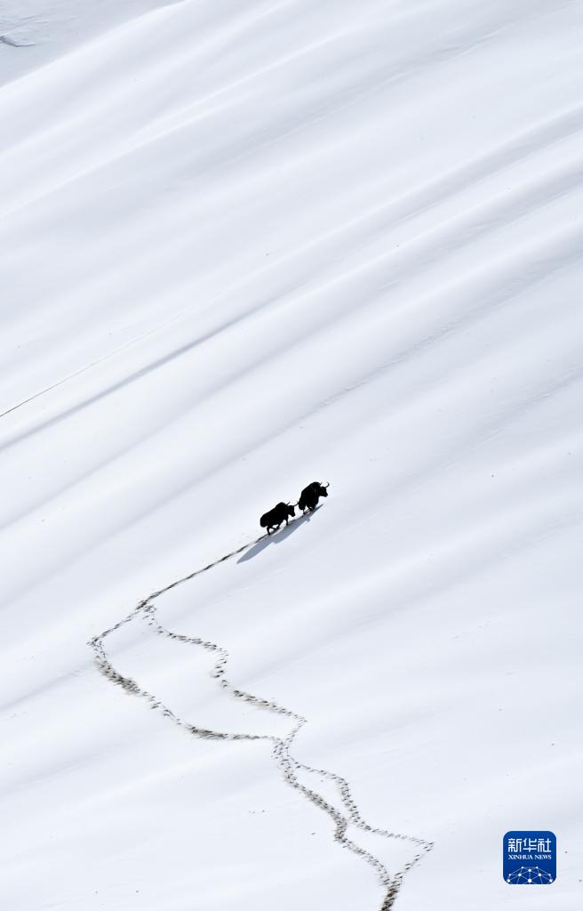 10月16日,在阿爾金山國家級自然保護區,野牦牛攀爬雪後的庫木庫裏沙漠。