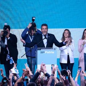 10月22日,阿根廷中左翼執政聯盟祖國聯盟候選人、現任經濟部長塞爾希奧·馬薩(中)在位於首都布宜諾斯艾利斯的競選總部發表演説。