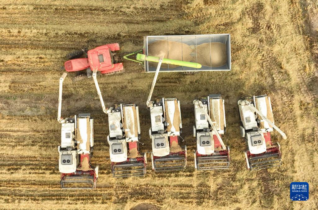 10月23日,水稻收割機在彰武縣大冷鎮上三家子村的稻田中將水稻裝車(無人機照片)。