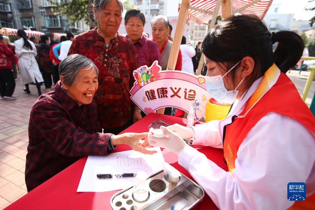 10月23日,在山東省濟南市洪家樓街道洪樓廣場社區,志願者為老年人開展健康義診。