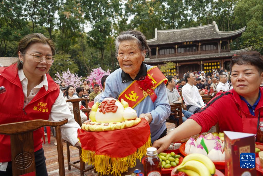 10月23日,在浙江省溫州市鹿城區九山書會,志願者為老壽星送上壽桃。