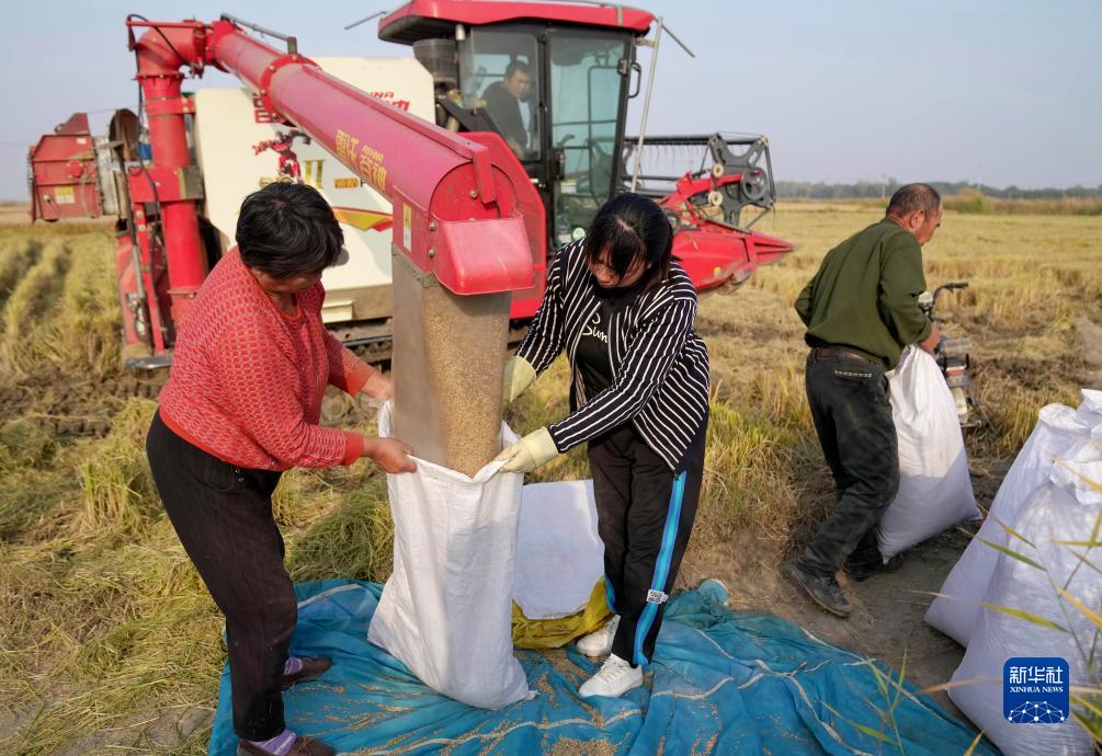 10月23日,河北省昌黎縣劉&莊鎮的農民在將收穫的水稻裝袋。