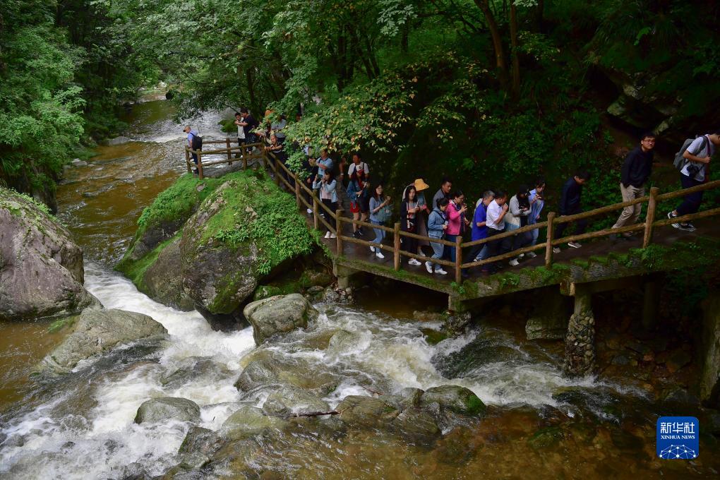 游客在位於朱家灣村的牛背梁國家森林公園內參觀游玩(2020年7月22日攝)。