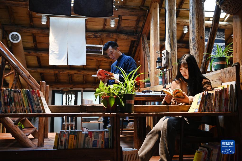 游客在朱家灣村一家民宿書吧內閱讀(3月3日攝)。