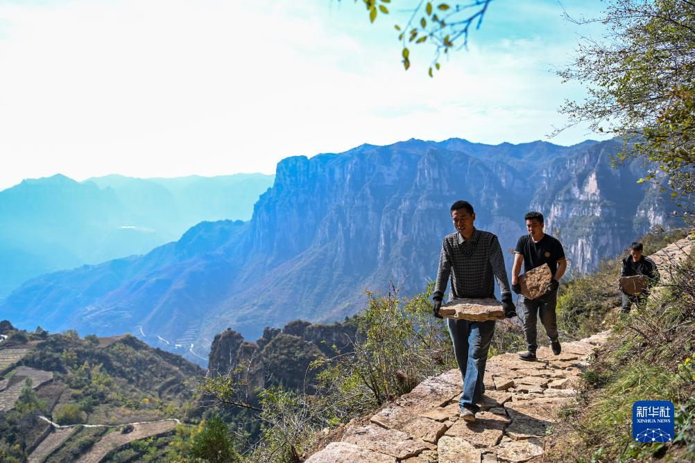 在壺關縣大峽谷鎮青龍峽村,牛何松(左)和村民們在山間搬運石塊(10月17日攝)。