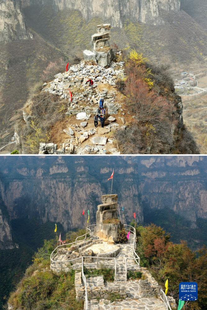 拼版照片:上圖為在壺關縣大峽谷鎮青龍峽村,村民們在山上修路(3月23日攝,無人機照片);下圖為修好的旅游步道(10月18日攝,無人機照片)。