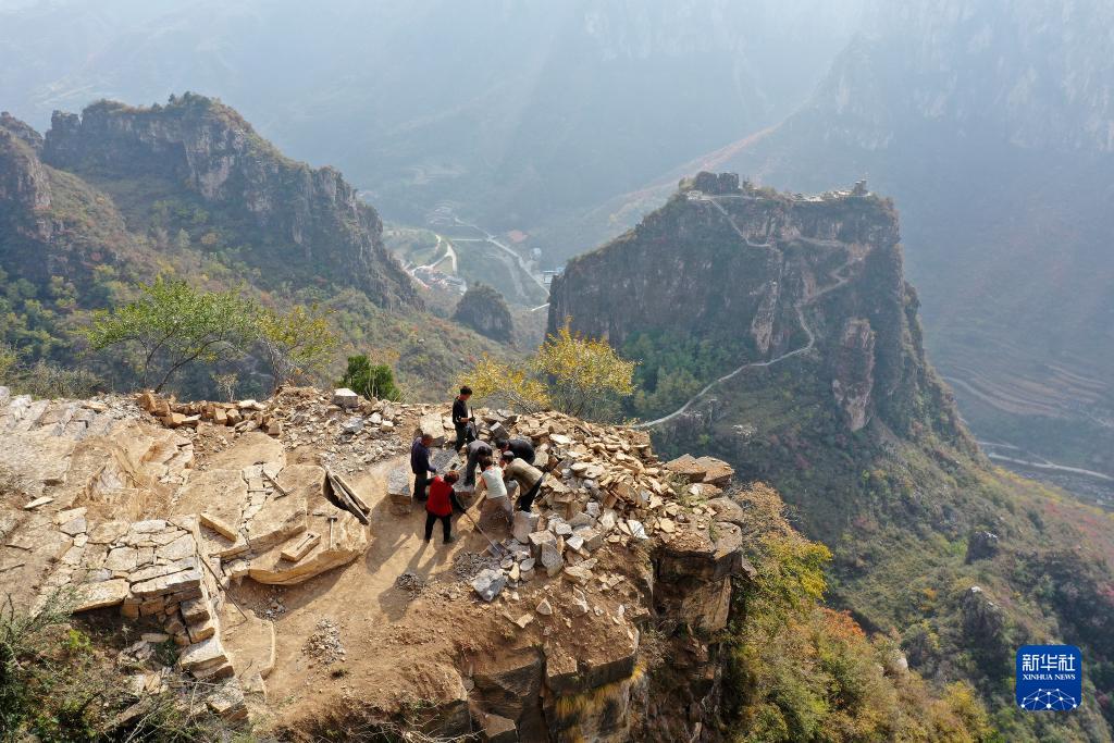 在壺關縣大峽谷鎮青龍峽村,村民們在山上修路,遠處是他們早先修好的旅游步道(10月17日攝,無人機照片)。