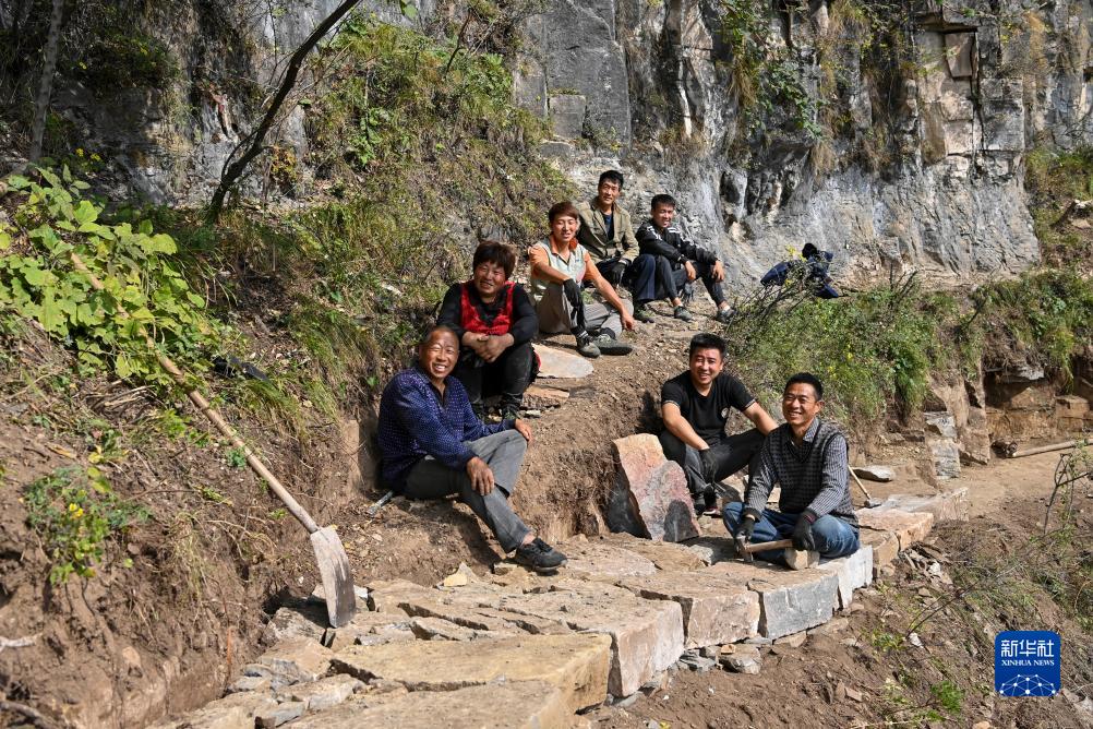 參與修路的村民在太行山上合影,從左至右為王成生、周建榮、牛麗朋、郭運增、郭林強、郭彥文、牛何松(10月17日攝)。
