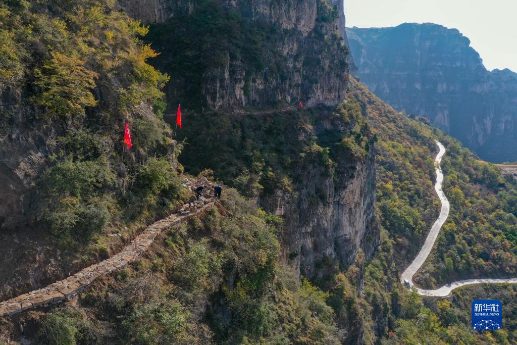 村民在太行山上修路(10月18日攝,無人機照片)。