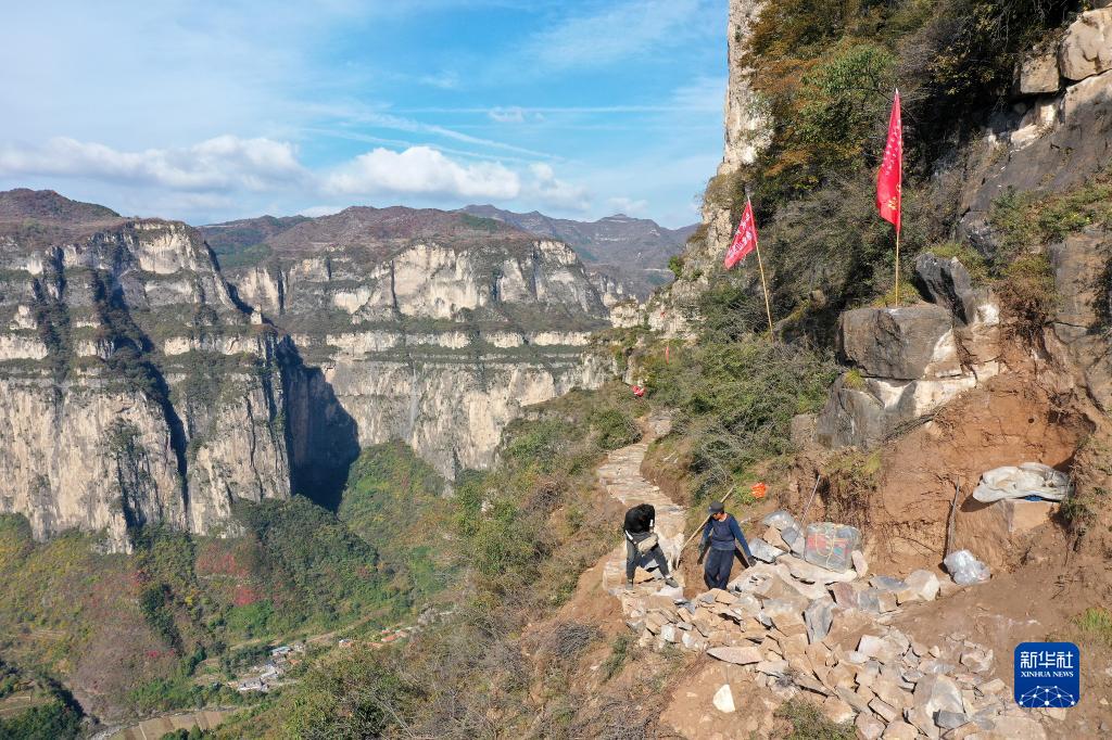 村民們在太行山上修路(10月18日攝,無人機照片)。