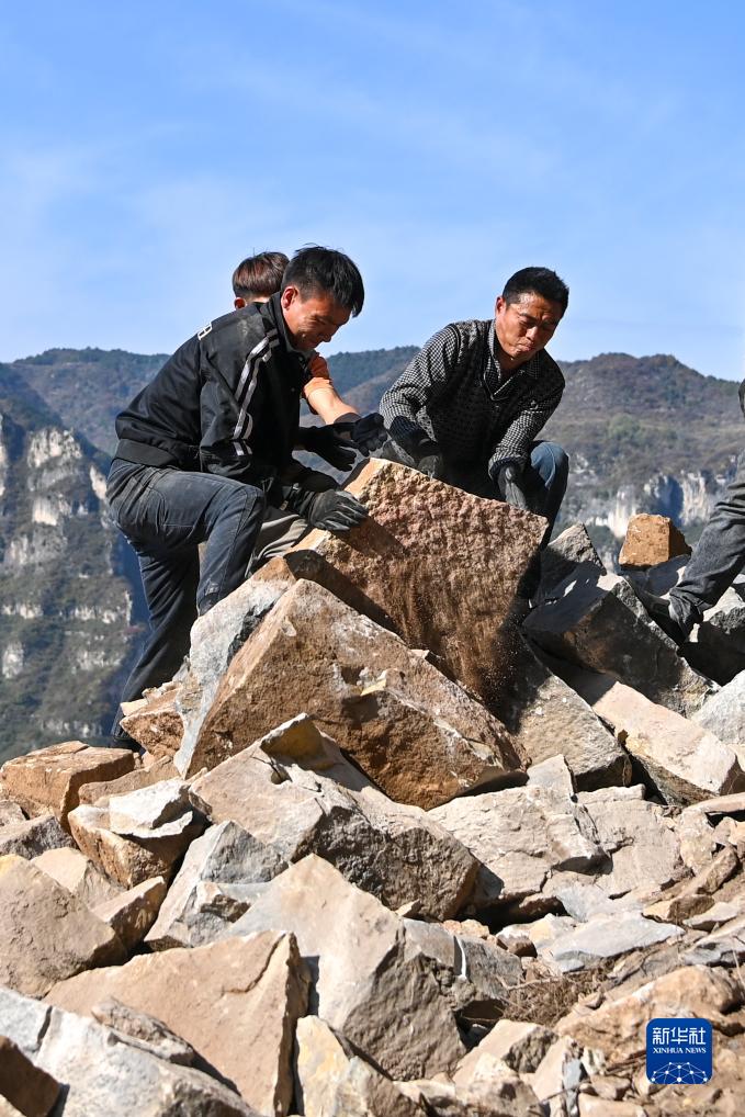 在壺關縣大峽谷鎮青龍峽村,郭林強(左)和牛何松(右)在山上搬運石塊(10月17日攝)。