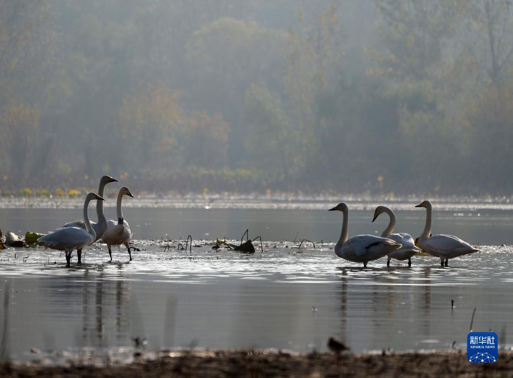 10月24日,大天鵝在三門峽市天鵝湖國家城市濕地公園內棲息。