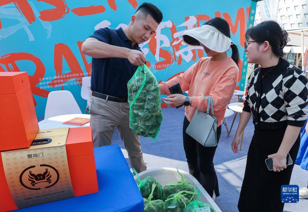 10月24日,游客在湖州市織裏鎮豐收節現場的農特産品嘉年華集市上選購太湖蟹。