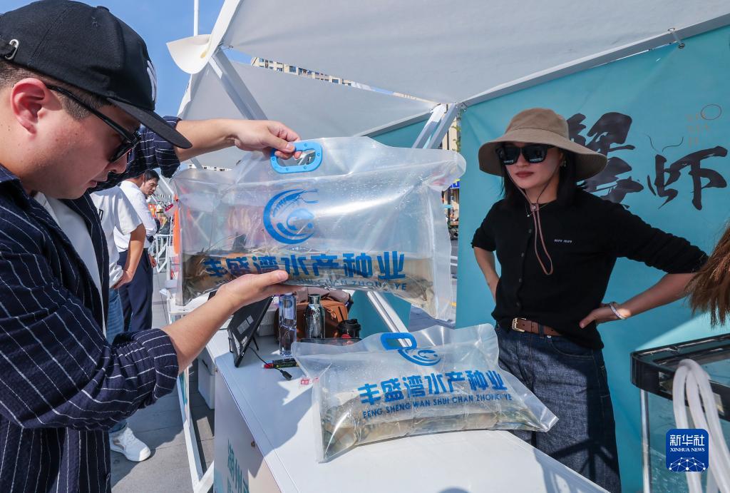 10月24日,游客在湖州市織裏鎮豐收節現場的農特産品嘉年華集市上選購沼蝦。