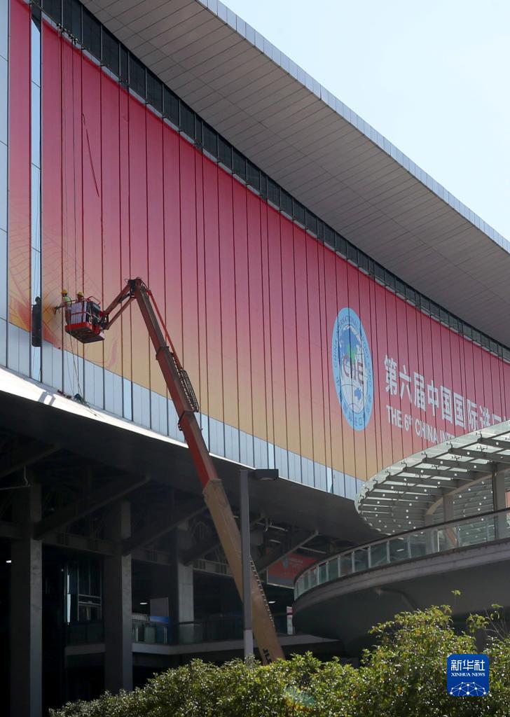 位於上海青浦的國家會展中心(上海)場館外部進博會主題裝飾工程目前已進入收尾階段,包括南廣場在內的四個&&口都已裝飾一新,迎接即將開幕的第六屆中國國際進口博覽會。