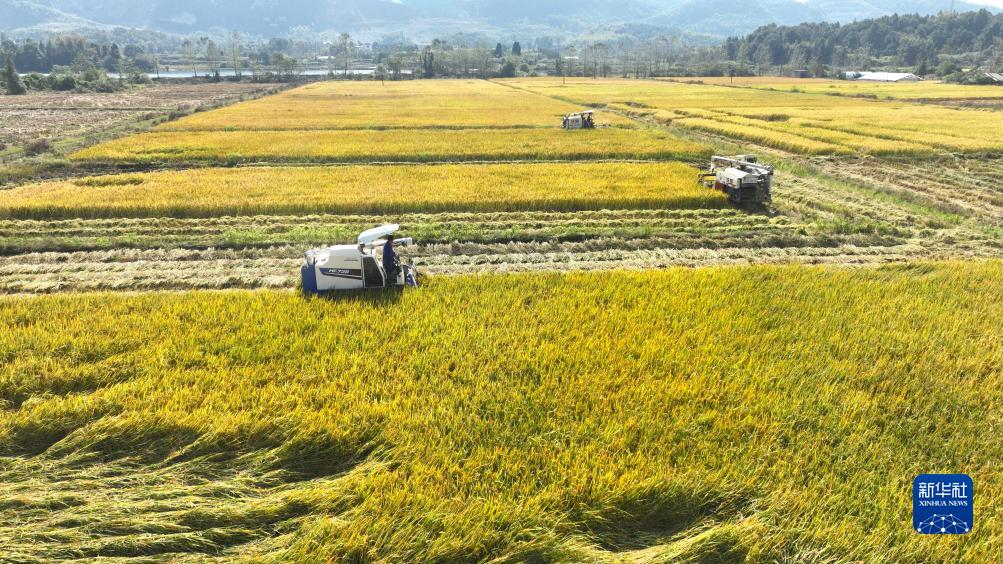 10月23日,農機手駕駛收割機在江西省分宜縣高嵐鄉千畝優質稻示範基地收穫稻穀(無人機照片)。
