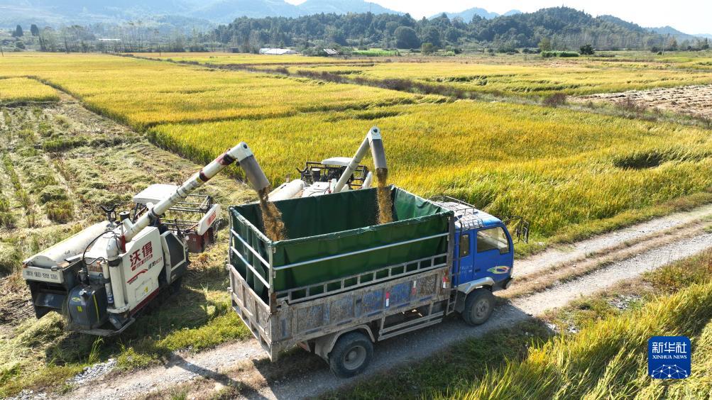 10月23日,在江西省分宜縣高嵐鄉千畝優質稻示範基地,收割機將收穫的稻穀裝入卡車(無人機照片)。