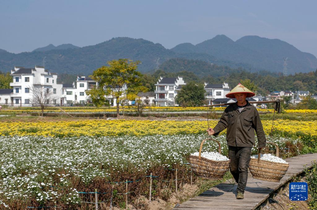 10月24日,安徽省黃山市休寧縣鹽鋪村農民挑運剛收穫的徽州貢菊。