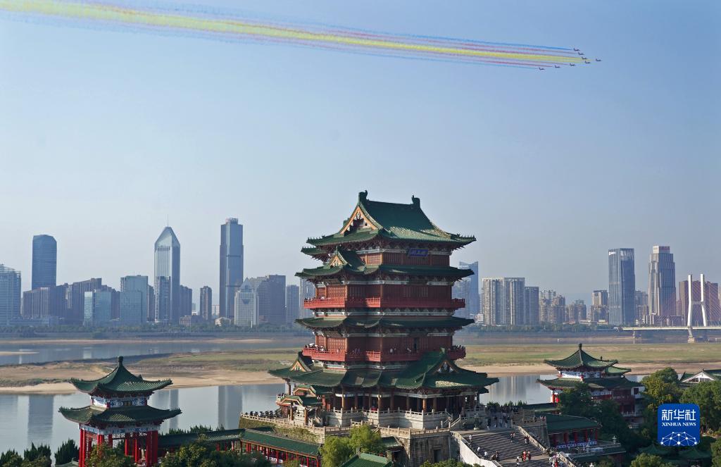 10月24日,空軍航空大學“紅鷹”飛行表演隊在南昌滕王閣景區上空進行飛行表演。