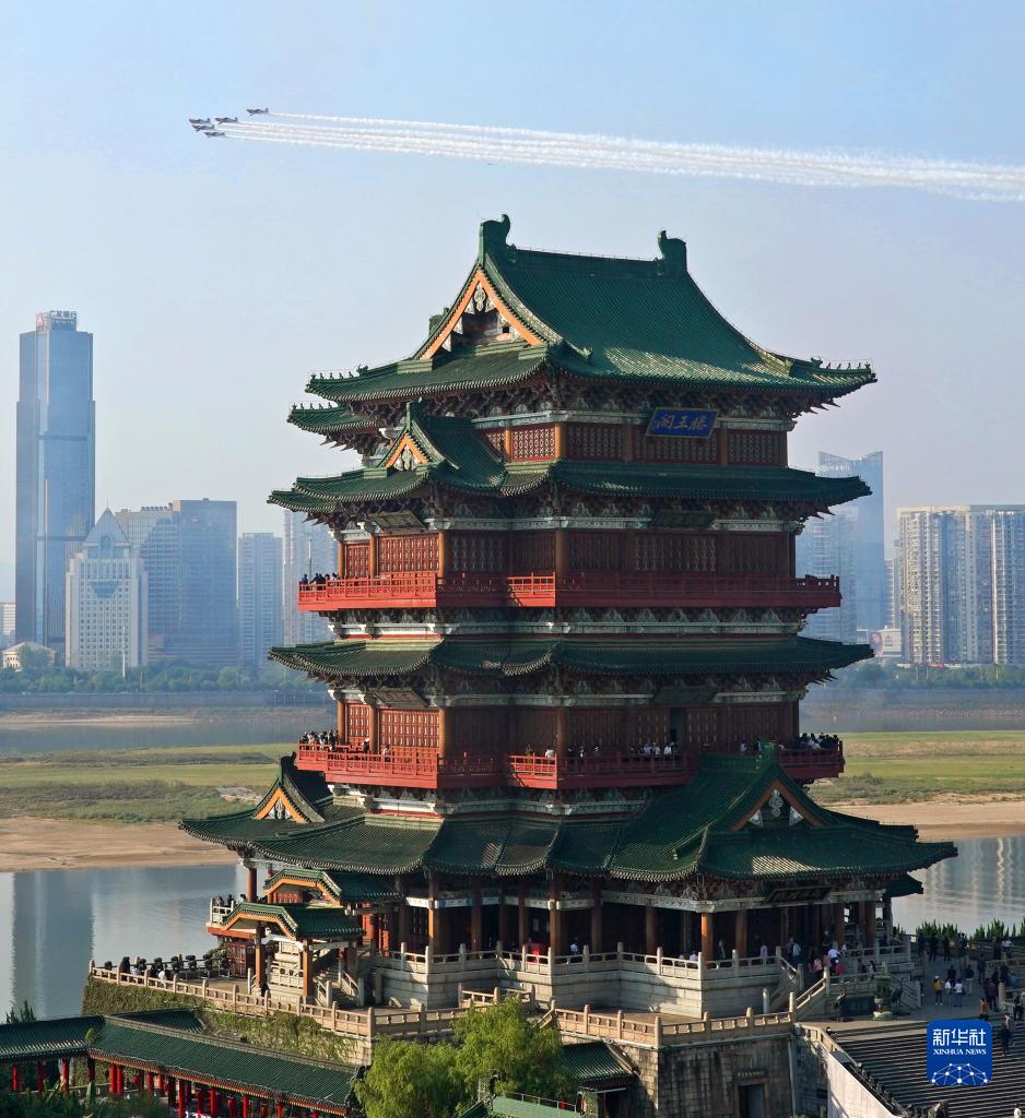 當日,2023中國航空産業大會暨南昌飛行大會組織空軍航空大學“紅鷹”飛行表演隊與歐洲環球之星特技飛行表演隊駕駛飛機在南昌市區上空進行了特技飛行表演,飛越滕王閣上空。