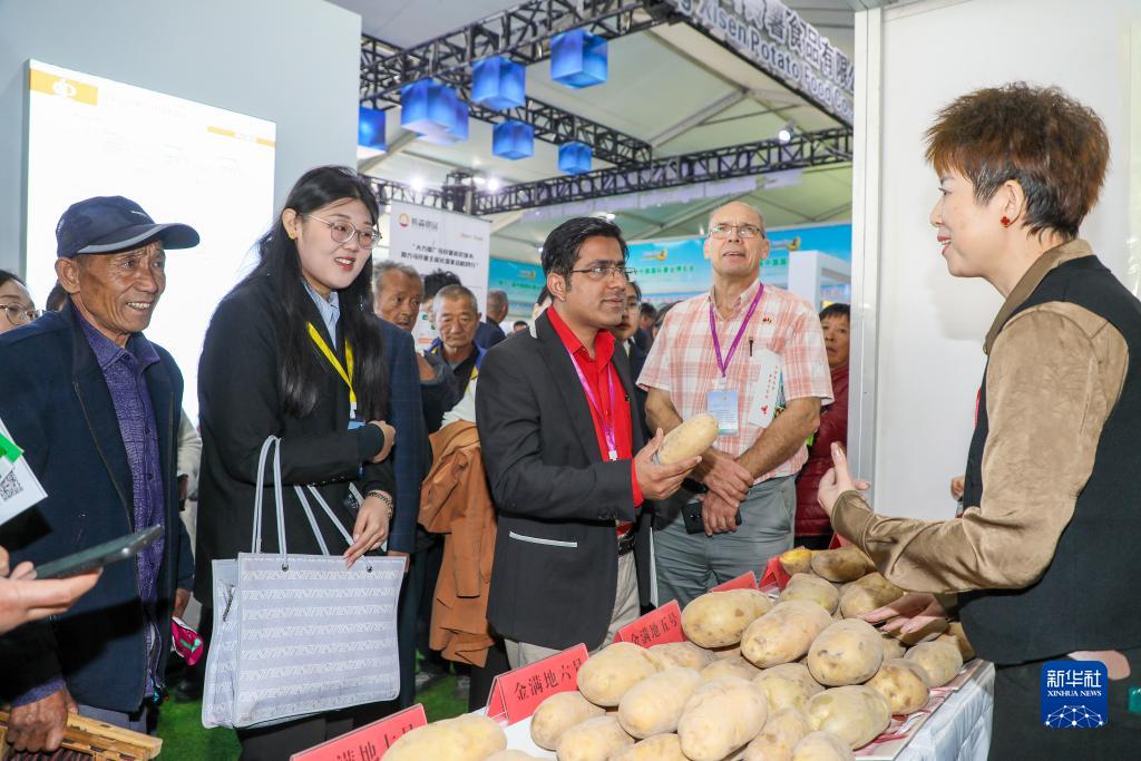 10月23日,在山東省滕州市大塢鎮展會現場,國外客商在了解馬鈴薯品種。