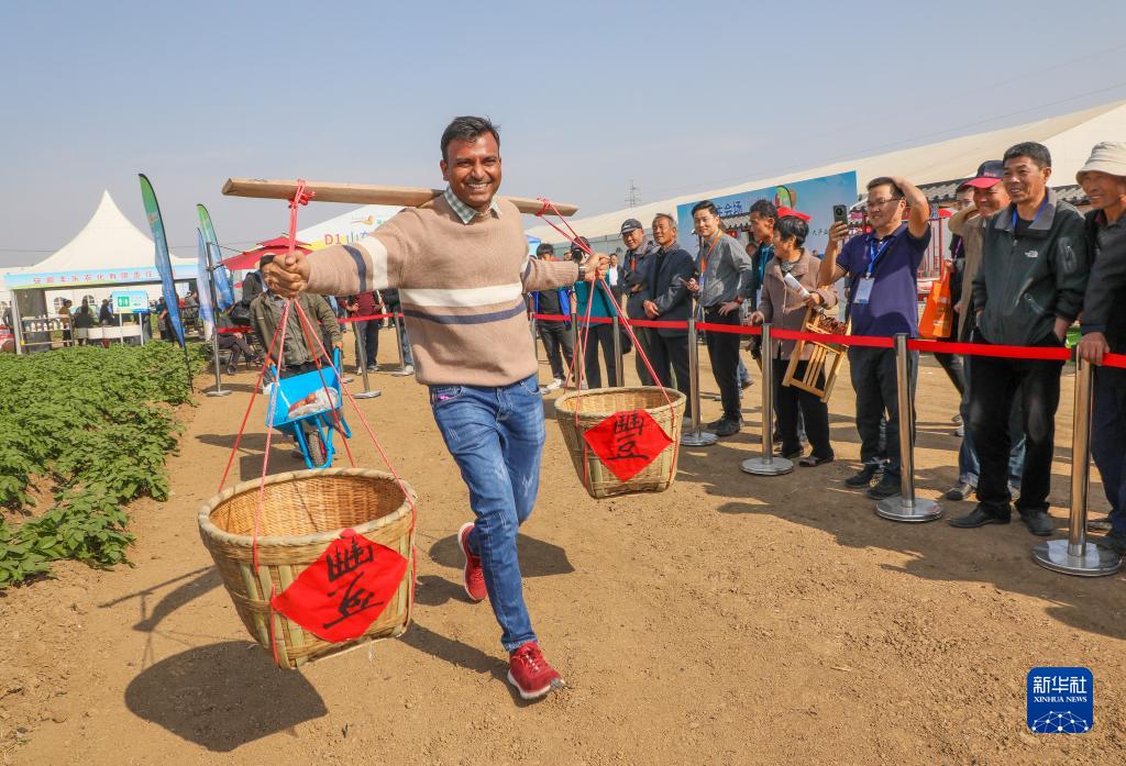 10月23日,在山東省滕州市大塢鎮展會現場,一名國外參展商參加馬鈴薯豐收慶祝活動。