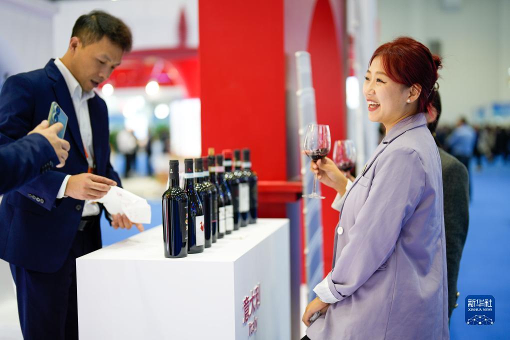 10月24日,參觀者在2023中國國際地理標誌品牌合作大會上品嘗紅酒。