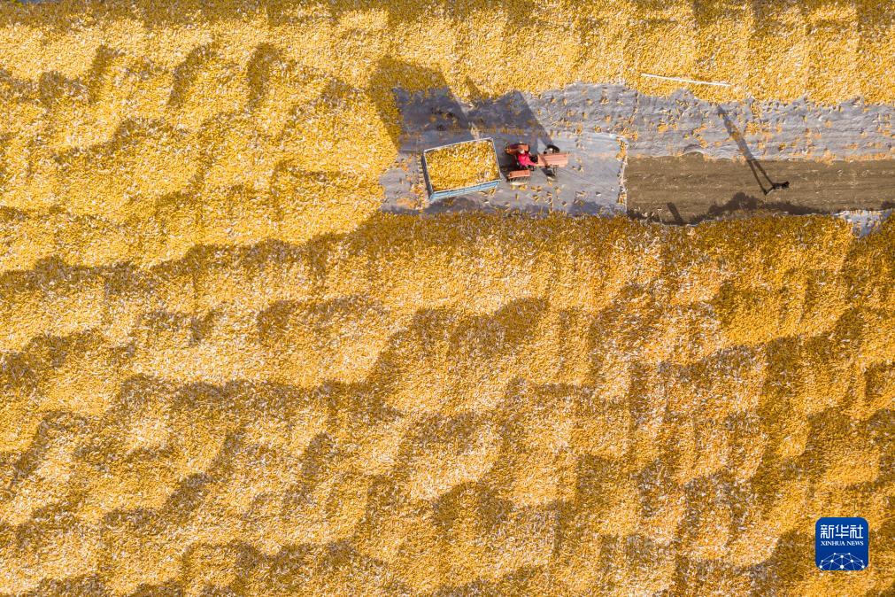 10月19日,在黑龍江省肇東市五里明鎮東升村,農民把收穫的玉米運到當地農業合作社指定的地點進行晾曬(無人機照片)。