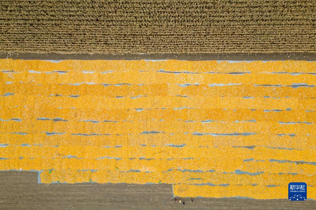 10月18日,在黑龍江省綏化市北林區張維鎮潤地農業種植合作社的一處玉米晾曬場,村民整理收穫的玉米(無人機照片)。