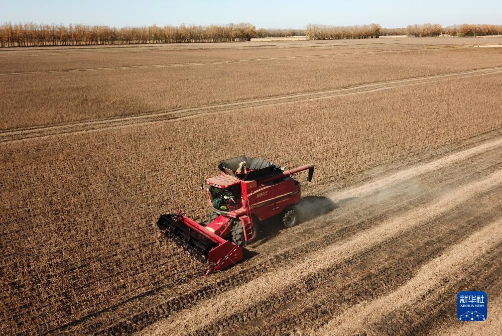 這是10月11日拍攝的收割機在黑龍江省富錦市收穫大豆(無人機照片)。