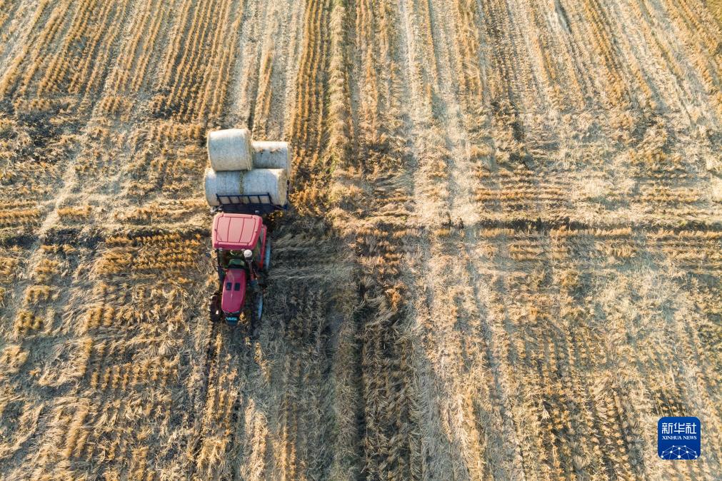10月18日,在黑龍江省尚志市河東朝鮮族鄉,農民駕駛拖拉機運輸打捆後的秸稈(無人機照片)。