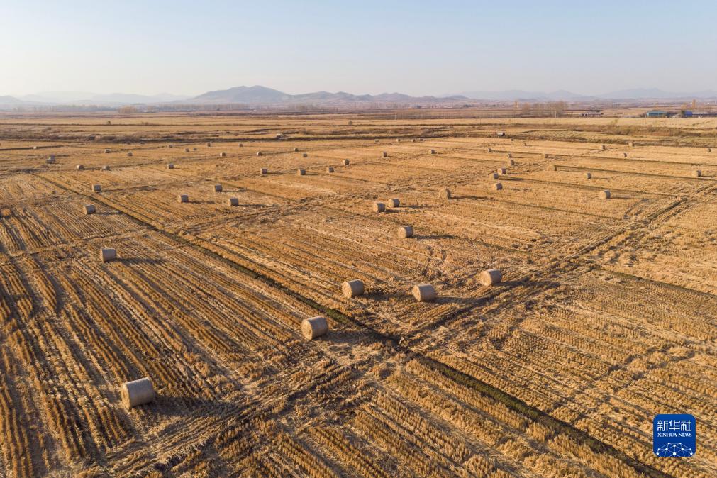 這是10月18日拍攝的黑龍江省尚志市河東朝鮮族鄉已收穫的田地和打捆後的秸稈(無人機照片)。